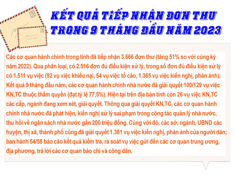 Kết quả, 9 tháng đầu năm 2023, tại trụ sở tiếp công dân, đại diện các cấp, ngành trong tỉnh đã tiếp 3.307 lượt công dân đến KN,TC, kiến nghị, phản ánh (riêng quý III/2023 có 1.189 lượt công dân, tăng 26% so với quý II/2023). Trong số 3.307 lượt tiếp công dân thuộc 9 tháng năm 2023 có 3.412 người được tiếp liên quan tới 2.618 vụ việc. Nội dung tập trung chủ yếu vào lĩnh vực môi trường, đất đai, bồi thường GPMB, tái định cư, cấp Giấy chứng nhận quyền sử dụng đất, thực hiện chế độ chính sách đối với người có công. Qua công tác tiếp công dân, các KN,TC, kiến nghị, phản ánh của công dân cơ bản được xem xét, giải quyết đúng quy định của pháp luật, củng cố, nhân lên lòng tin của nhân dân đối với cấp ủy, chính quyền, cơ quan quản lý nhà nước.