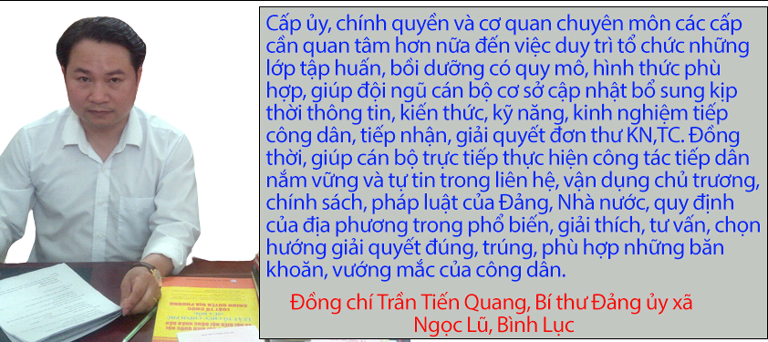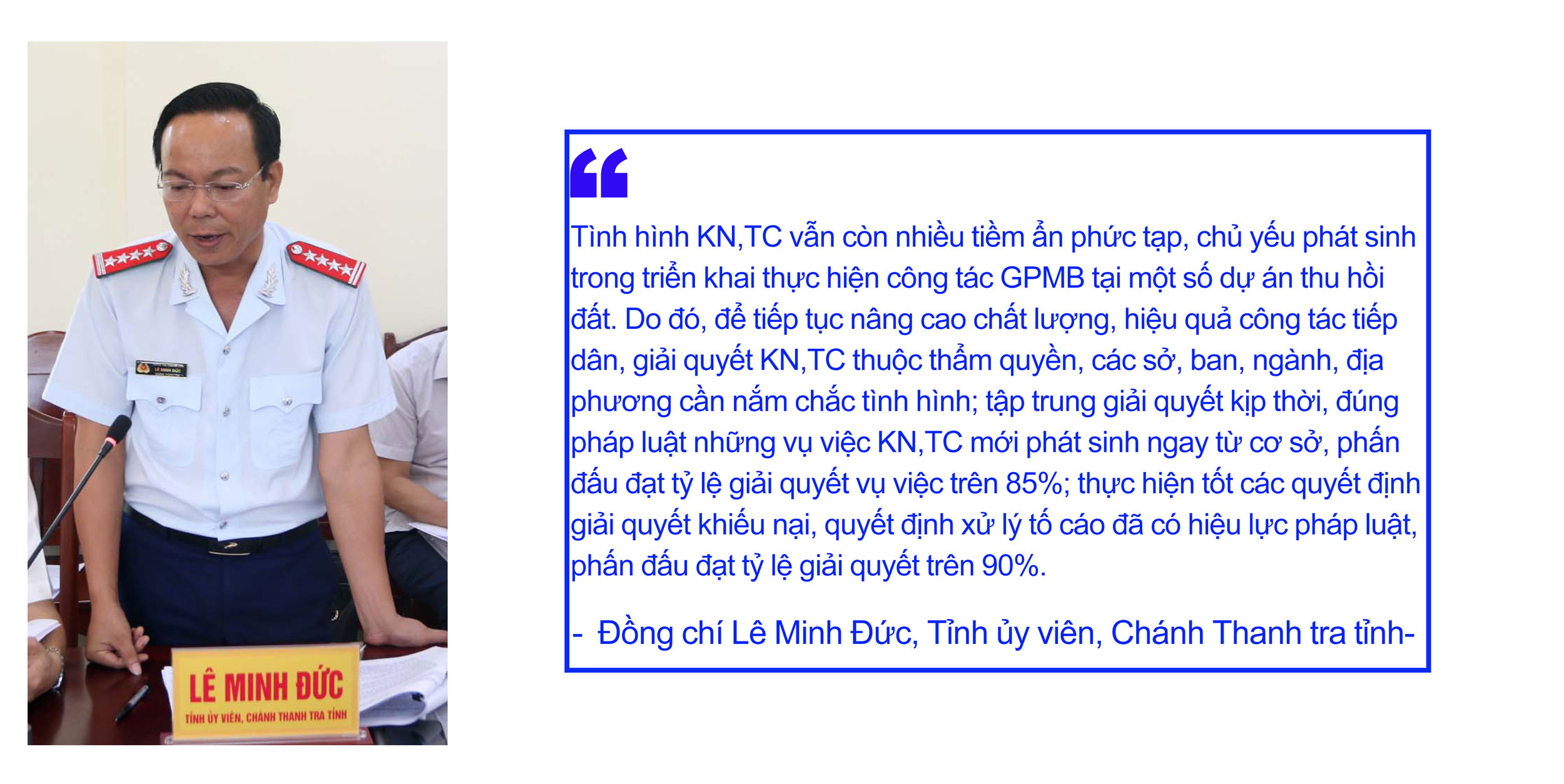 Công tác tiếp dân, xử lý đơn thư, giải quyết khiếu nại, tố cáo (KN,TC) là một trong những nhiệm vụ quan trọng, cần duy trì thực hiện nghiêm túc nhằm giữ vững ổn định tình hình ngay từ địa bàn cơ sở. Từ nhận thức trên, thời gian qua, các cấp, ngành, địa phương trong tỉnh đã tập trung lãnh đạo, chỉ đạo, tổ chức thực hiện đồng bộ, bài bản chế độ tiếp dân, giải quyết KN,TC. Nhờ vậy, chất lượng, hiệu quả giải quyết các vụ việc KN,TC đã được nâng lên rõ rệt. Nhiều vụ việc KN,TC được tập trung giải quyết ngay từ cơ sở, không phát sinh điểm nóng, vụ việc nổi cộm, góp phần quan trọng thúc đẩy phát triển kinh tế - xã hội ở địa phương.
