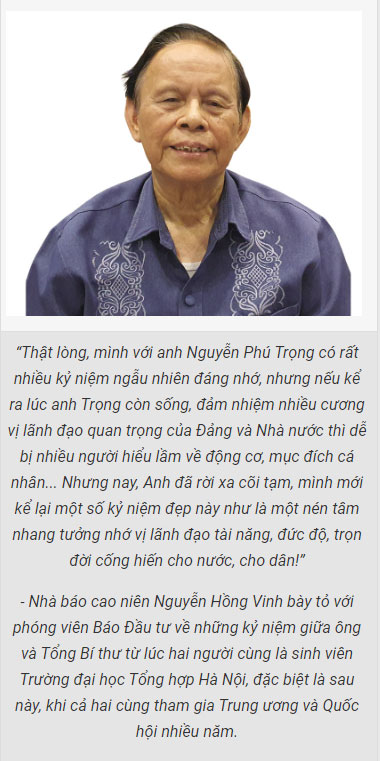 Sau khi hay tin Tổng Bí thư Nguyễn Phú Trọng qua đời, tôi đến thăm Nhà báo cao niên Nguyễn Hồng Vinh bày tỏ mong muốn được nghe về những kỷ niệm giữa ông và Tổng Bí thư từ lúc hai người cùng là sinh viên Trường đại học Tổng hợp Hà Nội, đặc biệt sau này, khi cả hai cùng tham gia Trung ương và Quốc hội nhiều năm.
