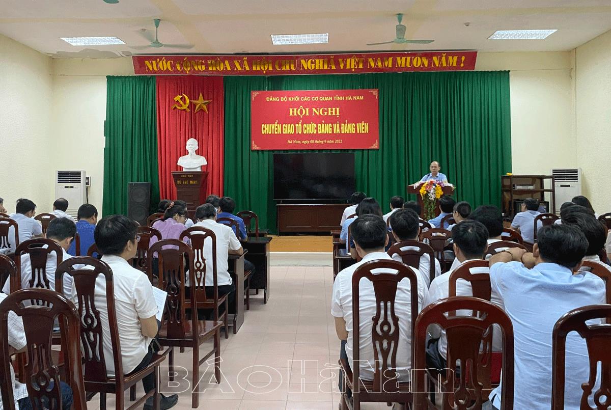Sáng 8/9, Đảng uỷ Khối các cơ quan tỉnh tổ chức hội nghị chuyển giao 6 chi bộ Chi nhánh Văn phòng đăng ký đất đai và 40 đảng viên trực thuộc Đảng bộ Sở Tài nguyên và Môi trường Hà Nam về trực thuộc Đảng bộ các huyện, thành phố, thị xã. Dự hội nghị có đồng chí Đặng Thanh Sơn, Uỷ viên Ban Thường vụ Tỉnh uỷ, Phó Chủ tịch Thường trực HĐND tỉnh.