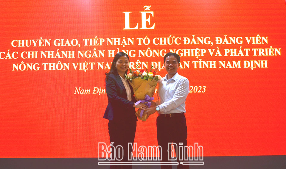 Chiều 12-4, Đảng ủy Khối các Cơ quan và Doanh nghiệp (CQ và DN) tỉnh và Đảng ủy Ngân hàng Nông nghiệp và Phát triển nông thôn Việt Nam (Agribank) đã tổ chức lễ chuyển giao - tiếp nhận tổ chức cơ sở Đảng và đảng viên của Chi nhánh Agribank tỉnh Nam Định, Chi nhánh Agribank Bắc Nam Định về Trung ương. Các đồng chí: Vũ Hữu Thi, TUV, Bí thư Đảng ủy Khối các CQ và DN tỉnh; Trương Anh Tuấn, TUV, Phó Trưởng ban Thường trực Ban Tổ chức Tỉnh ủy; Nguyễn Thị Thảo, Ủy viên Ban Thường vụ Đảng ủy, thành viên Hội đồng thành viên Agribank tới dự.