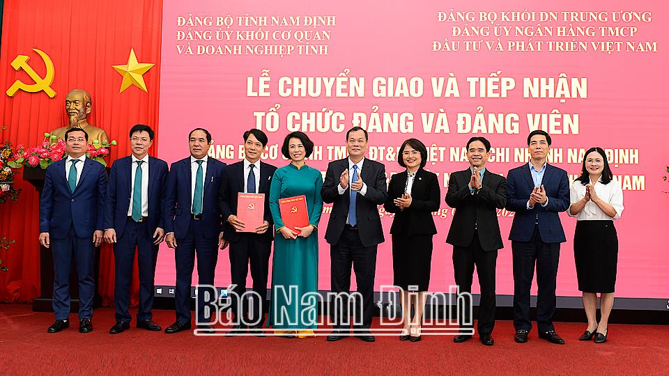Tại buổi lễ, lãnh đạo Đảng ủy Khối các Cơ quan và Doanh nghiệp tỉnh đã công bố, trao Quyết định số 643-QĐ/TU, ngày 14-3-2023 của Tỉnh ủy Nam Định về việc chuyển giao 2 tổ chức cơ sở Đảng gồm: Đảng bộ BIDV Chi nhánh Nam Định và Đảng bộ BIDV Chi nhánh Thành Nam cùng 100 đảng viên trực thuộc Đảng bộ Khối các Cơ quan và Doanh nghiệp tỉnh về Đảng bộ BIDV thuộc Đảng bộ Khối Doanh nghiệp Trung ương. Quyết định của Tỉnh ủy nhằm thực hiện Quy định số 60-QĐ/TW, ngày 8-3-2022 của Ban Bí thư về tổ chức đảng trong các tập đoàn, tổng công ty, ngân hàng thương mại Nhà nước và Công văn hướng dẫn của Ban Tổ chức Trung ương. Theo đó, Đảng ủy Khối các Cơ quan và Doanh nghiệp tỉnh và Đảng ủy BIDV đã thực hiện lễ ký chuyển giao - tiếp nhận tổ chức cơ sở Đảng và đảng viên để hoạt động theo mô hình mới.
