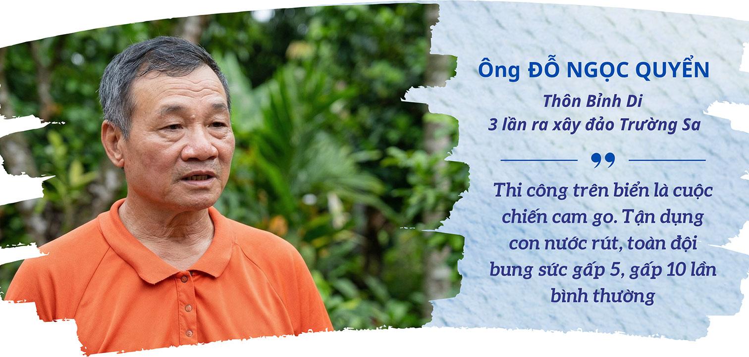 Ngọn lửa nhiệt huyết từ những người đi trước thôi thúc các hiệp thợ Bỉnh Di nối tiếp lên đường. Ông Đỗ Ngọc Quyển mang trong mình ký ức về ba lần vượt sóng ra Trường Sa. Năm 1993, ông cùng tốp thợ lênh đênh trên biển suốt 2 ngày 1 đêm tiến ra đảo Sinh Tồn. Cập bờ, nhóm thợ lập tức bắt tay xây dựng nhà chỉ huy và hệ thống công trình phụ trợ.