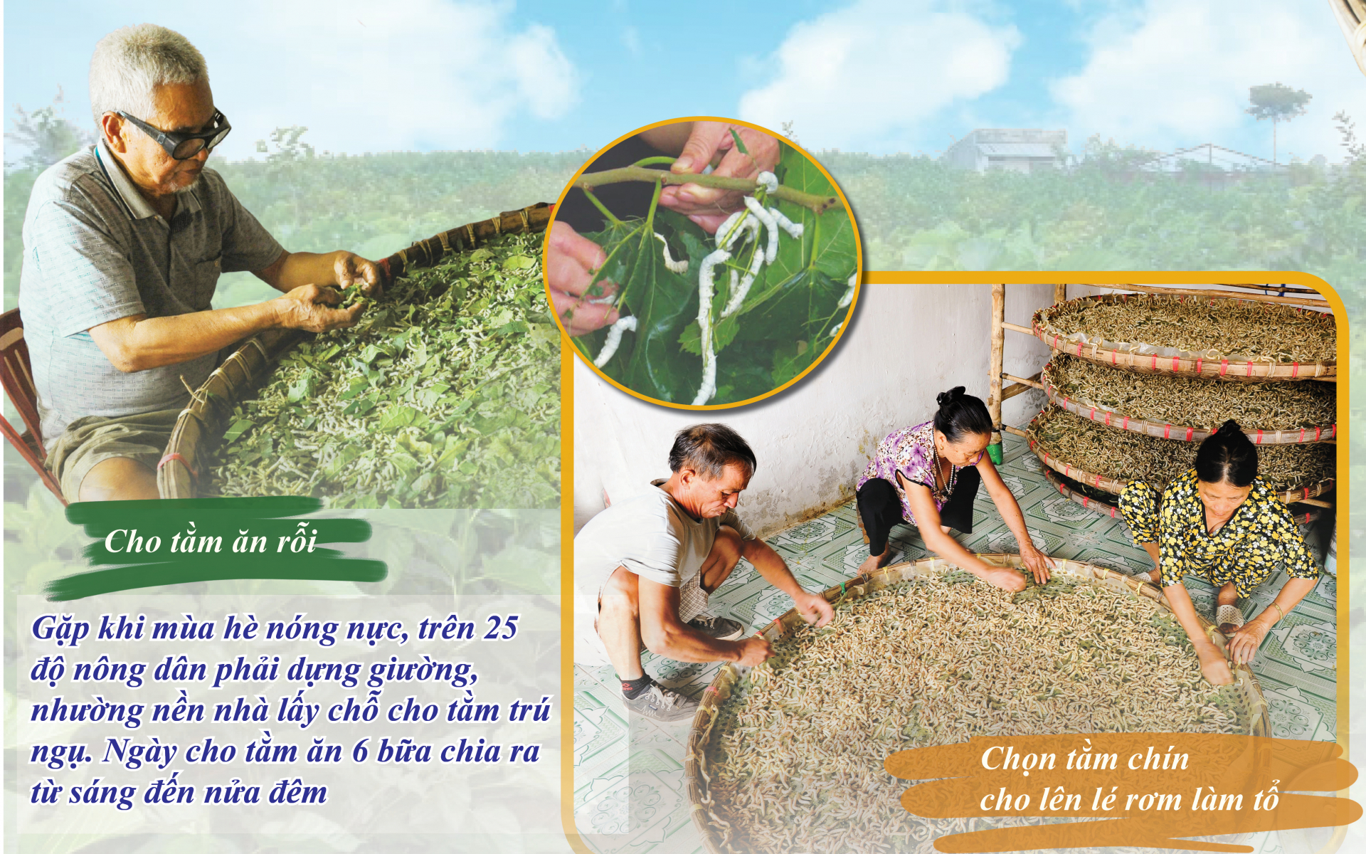 Hái những lá dâu tươi đầy nhựa, ngắt bỏ lá già, lá sâu. Lá dâu phải khô, phải sạch, không bị nhiễm các loại thuốc bảo vệ thực vật. Nhà nuôi tằm phải sạch sẽ, thông thoáng. Gặp khi mùa hè nóng nực, trên 25 độ nông dân phải dựng giường, nhường nền nhà lấy chỗ cho tằm trú ngụ. Ngày cho tằm ăn 6 bữa chia ra từ sáng đến nửa đêm, ngày vệ sinh một lượt, thu cọng dâu thừa quét dọn phân tằm sạch sẽ, thường xuyên kiểm tra, theo dõi kiến, côn trùng xâm nhập hại tằm.