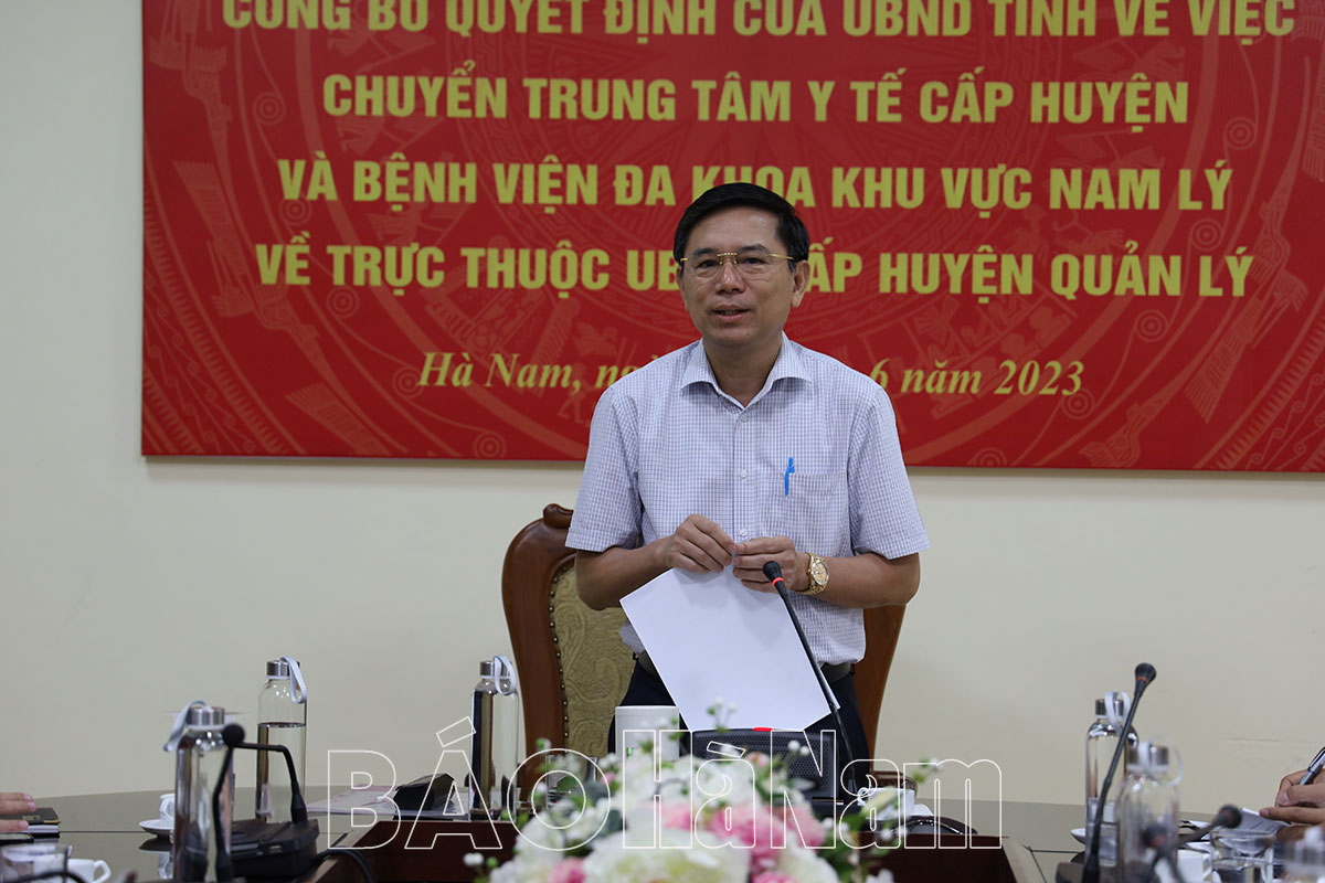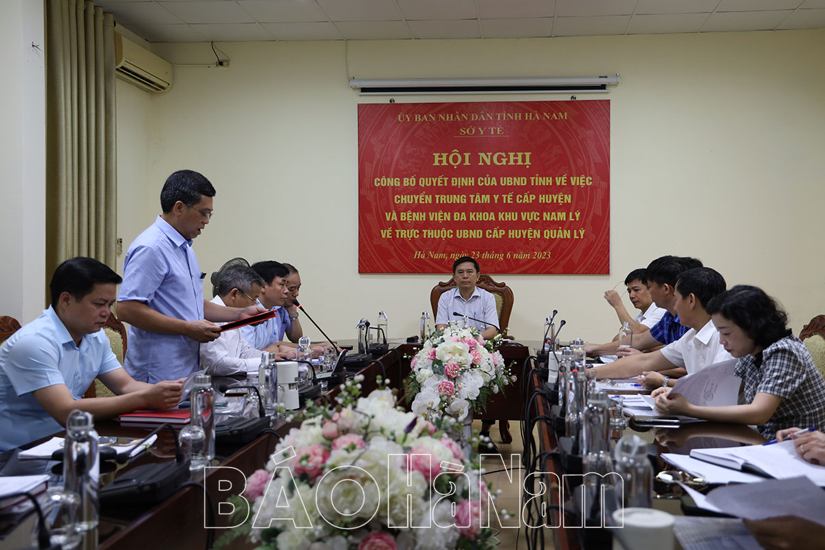 Sáng 23/6, Sở Y tế tổ chức hội nghị công bố Quyết định về việc chuyển Trung tâm Y tế (TTYT) các huyện, thị xã, thành phố và Bệnh viện Đa khoa (BVĐK) khu vực Nam Lý, huyện Lý Nhân trực thuộc Sở Y tế về trực thuộc UBND các huyện, thị xã, thành phố quản lý.