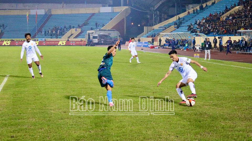 | Tình huống tranh chấp bóng giữa các cầu thủ Thép Xanh Nam Định và LPBank Hoàng Anh Gia Lai. |