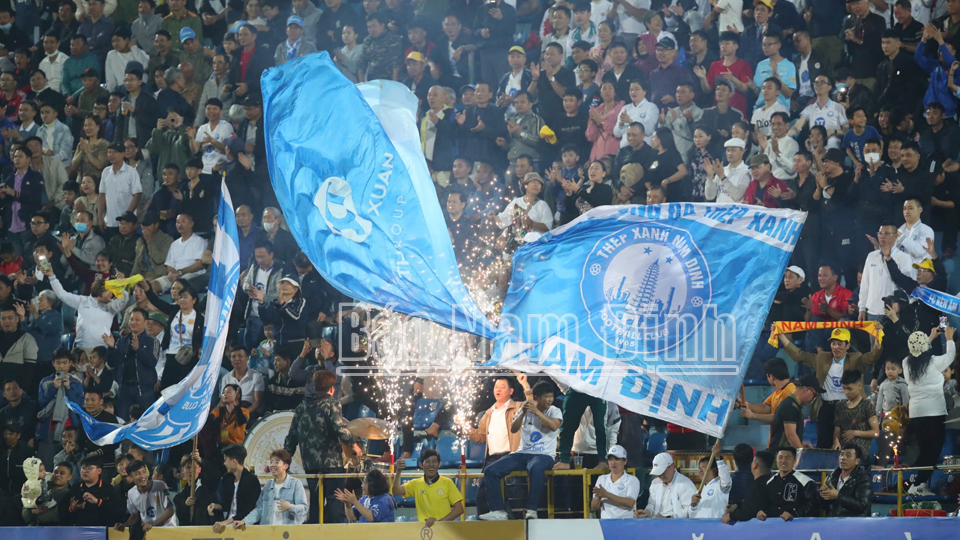 | Cổ động viên bóng đá Nam Định ăn mừng bàn thắng mở tỷ số trận đấu. |