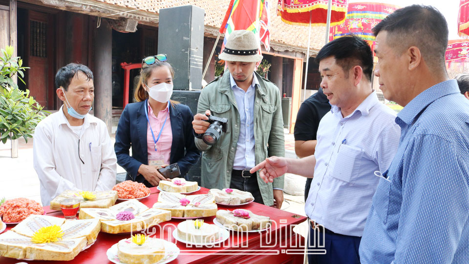 | Du khách tìm hiểu, trải nghiệm cỗ giò dâng Thánh tại Đền Gin, xã Nam Dương (Nam Trực). |