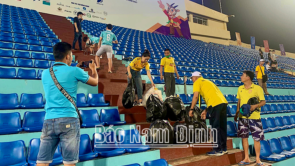 | Cổ động viên bóng đá Nam Định nhặt rác sau trận đấu giữa U23 Thái Lan và U23 Singapore.