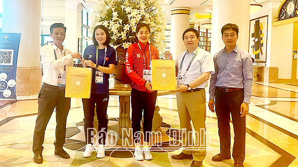 | Lãnh đạo Sở VH, TT và DL động viên 2 VĐV điền kinh Nam Định là Nguyễn Thị Huyền và Đinh Thị Bích tham dự SEA Games 31.
