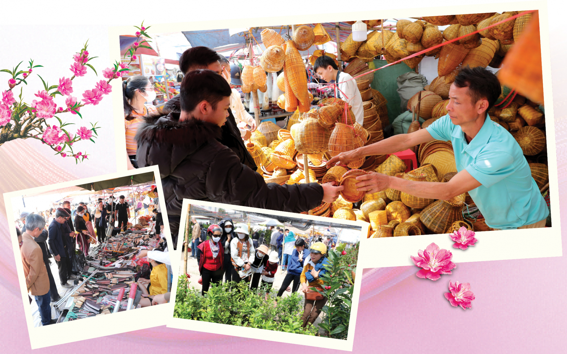 | Các sản phẩm nông nghiệp mây tre đan bày bán mang ý nghĩa cầu may tại chợ Viềng Xuân Vụ Bản. |