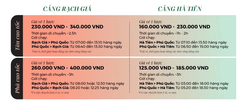 Với lộ trình Rạch Giá - Phú Quốc, có 4 hãng tàu cao tốc đang hoạt động là Superdong, Ngọc Thành, Hòa Bình Ship và Phú Quốc Express. Thời gian di chuyển trung bình 2,5 giờ. Giá vé tàu dao động từ 230.000 đồng đến 340.000 đồng/lượt tùy theo hãng và loại vé người lớn hoặc trẻ em. hằng ngày, có khoảng 13 chuyến tàu khác nhau chạy tuyến Rạch Giá - Phú Quốc từ 7 giờ 00 - 13 giờ 10. Chiều ngược lại từ 6 giờ 30 - 13 giờ 30.