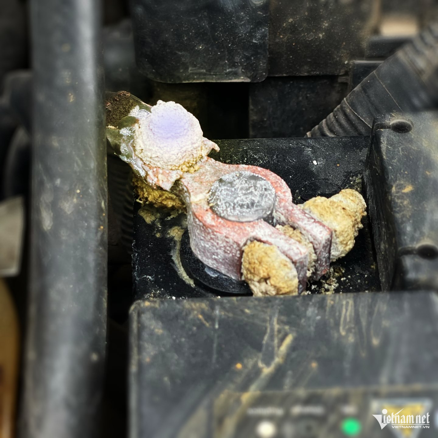 Cọc bình ắc quy bị sùi mốc là dấu hiệu của sự rò rỉ axit bên trong. Ảnh: Hoàng Hiệp