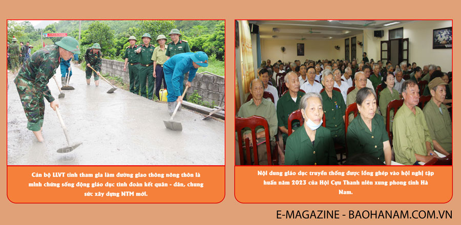 Theo Anh hùng lực lượng vũ trang, Chủ tịch Hội Cựu chiến binh (CCB) huyện Bình Lục - Trần Đức Cơ, thời gian qua các cấp hội CCB cùng với các cấp bộ đoàn thanh niên rất tích cực “linh hoạt hóa” cách thức triển khai hoạt động giáo dục truyền thống thông qua một số hình thức: Tham mưu, phối hợp tổ chức thi viết bài tìm hiểu lịch sử đảng bộ địa phương; thi tìm hiểu văn hóa đồng chiêm; giao lưu, tọa đàm, nghe nói chuyện chuyên đề; mít tinh kỷ niệm... giúp thanh niên, học sinh hiểu rõ hơn về ý nghĩa lịch sử của những sự kiện, ngày lễ trọng đại trong năm. Cùng với đó, phối hợp tổ chức hoạt động “Đền ơn đáp nghĩa”, “Uống nước nhớ nguồn” bằng những công trình, phần việc phù hợp, như vận động hội viên, đoàn viên, thanh niên, học sinh tham gia chỉnh trang cảnh quan nghĩa trang, thắp nến tri ân các anh hùng liệt sĩ, tặng quà thương binh, Mẹ Việt Nam Anh hùng nhân kỷ niệm Ngày Thương binh- Liệt sĩ hằng năm. Đây là hình thức giáo dục trực quan cụ thể, sinh động và thiết thực, giúp thế hệ trẻ vừa tiếp cận thông tin về truyền thống lịch sử, vừa thể hiện sự tôn vinh, tri ân những thế hệ cha anh đã hy sinh máu xương để đổi lại cuộc sống hòa bình, tự do, hạnh phúc hôm nay. Đồng thời, nhân lên niềm tin, niềm tự hào cũng như nhắc nhở thế hệ thanh niên, học sinh ngày nay về trách nhiệm tiếp bước cha anh, kế tục sự nghiệp xây dựng, bảo vệ Tổ quốc, bảo vệ thành quả cách mạng. Bên cạnh đó, công tác giáo dục truyền thống cho thế hệ thanh niên, học sinh còn được lồng ghép khéo léo vào chương trình các chiến dịch thanh niên tình nguyện hằng năm với rất nhiều công trình, phần việc phù hợp, gần sát thực tế đời sống, có ý nghĩa và sức lan tỏa sâu rộng, tích cực trong cộng đồng.