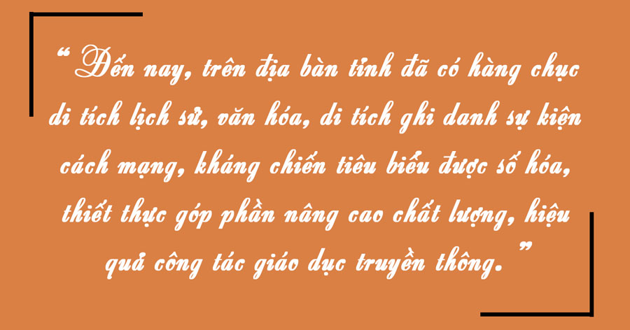 Để công tác giáo dục truyền thống bắt kịp với nhịp điệu sôi động của đời sống thông tin hiện tại, các cấp, ngành, đoàn thể, cơ sở giáo dục cũng cần mạnh dạn ứng dụng, phát huy lợi thế của công nghệ, nền tảng số vào quá trình truyền tải, lan tỏa những kiến thức, tư liệu lịch sử, văn hóa… đến với đối tượng tiếp nhận một cách nhanh nhất, tiện dụng và hiệu quả nhất. Thời gian qua, nhiều đơn vị, địa phương trong tỉnh đã mạnh dạn ứng dụng công nghệ số vào hoạt động của bảo tàng, nhà truyền thống và một số di tích lịch sử, văn hóa, danh thắng tiêu biểu… để thu hút công chúng, nhất là thanh thiếu niên, học sinh. Cùng đó, xây dựng chủ đề sinh hoạt văn hóa, các trò chơi gắn với giáo dục truyền thống, lịch sử, hoặc ứng dụng công nghệ thông tin vào quá trình “sân khấu hóa” những tác phẩm, nhân vật lịch sử, văn học tiêu biểu... nhằm nâng cao hiệu quả công tác giáo dục truyền thống.