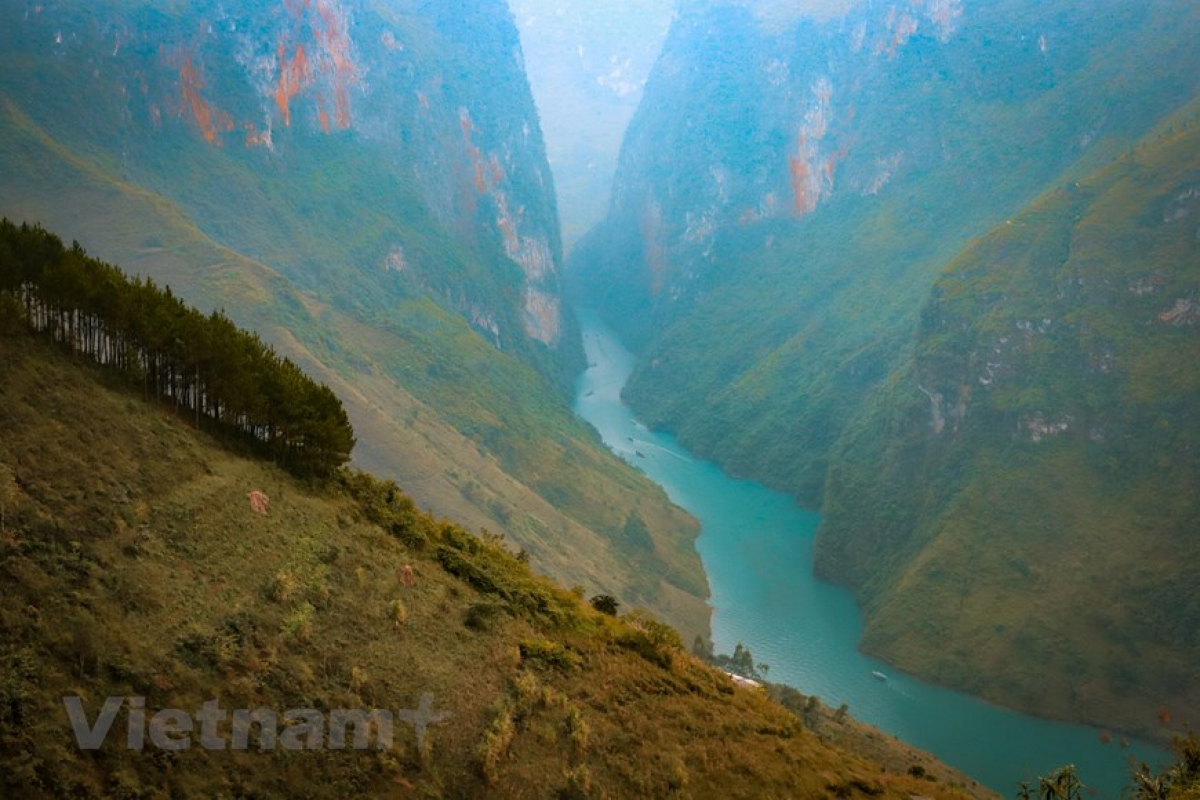 Tại chân đèo Mã Pì Lèng, bạn có thể phóng tầm mắt đến vách đá trắng Hà Giang. Khi chinh phục vách đá này bạn chắc chắn sẽ phải trầm trồ trước vẻ đẹp thiên nhiên hùng vĩ, mây trời trong xanh, dòng sông Nho Quế uốn lượn xẻ đôi cả núi đồi. (Ảnh: Hoài Nam/Vietnam+)