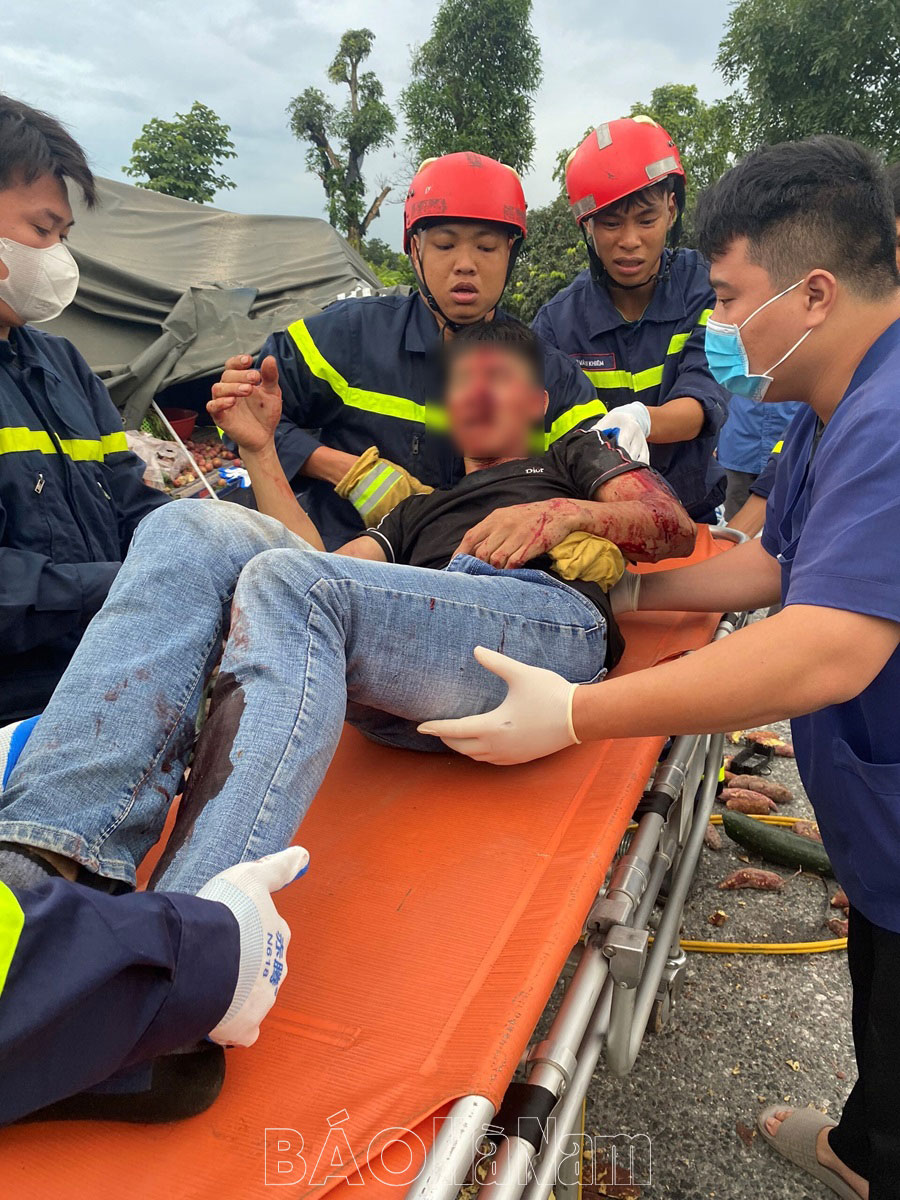 Sau khoảng 05 phút sử dụng thiết bị banh, cắt thủy lực, cán bộ chiến sỹ Cảnh sát PCCC&CNCH đã đưa nạn nhân ra ngoài an toàn và bàn giao cho lực lượng y tế để đưa đi cấp cứu kịp thời.