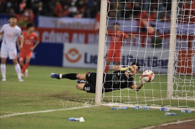 Tình huống phản lưới nhà của đội trưởng Bùi Tiến Dũng (số 4, Viettel) rút ngắn tỷ số trận đấu còn 1-2.