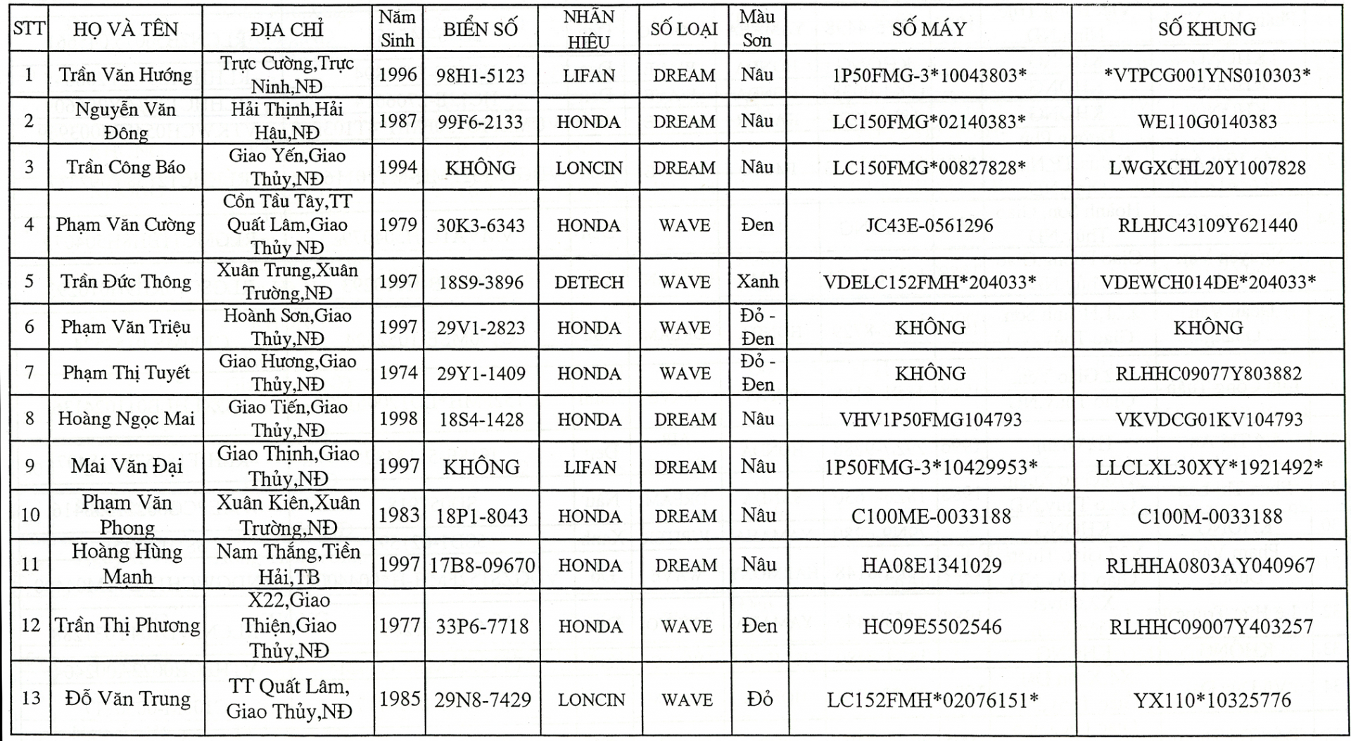 Để phục vụ cho việc xử lý, Công an huyện Giao Thuỷ - tỉnh Nam Định đề nghị Toà soạn Báo Nam Định thông báo tất cả các phương tiện xe môtô (có danh sách kèm theo) trên Báo Nam Định. Nếu ai là chủ sở hữu, người vi phạm của các phương tiện thì liên hệ với Công an huyện Giao Thuỷ - Nam Định để giải quyết.