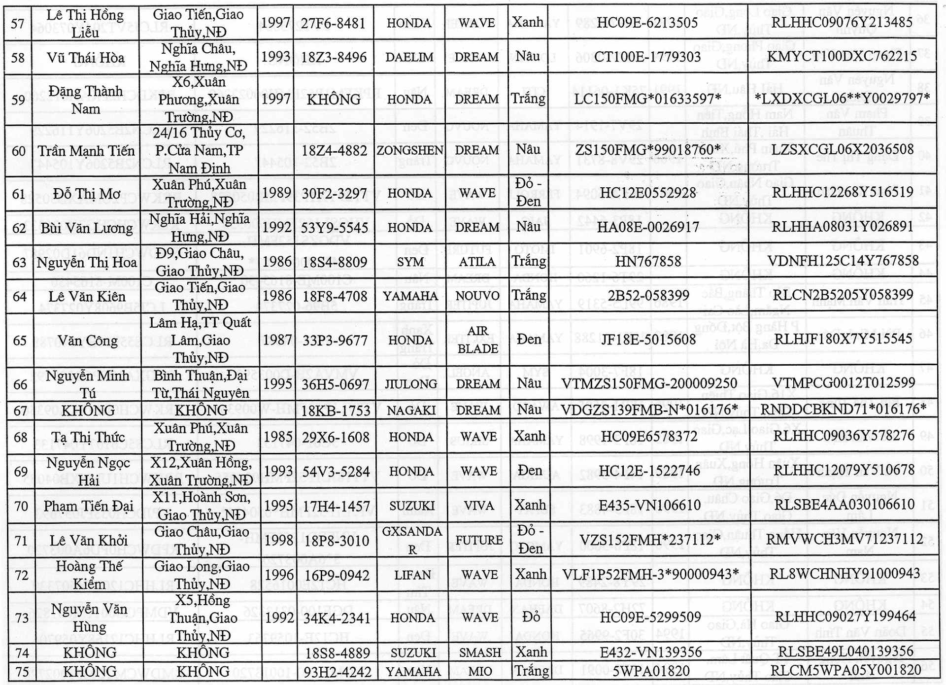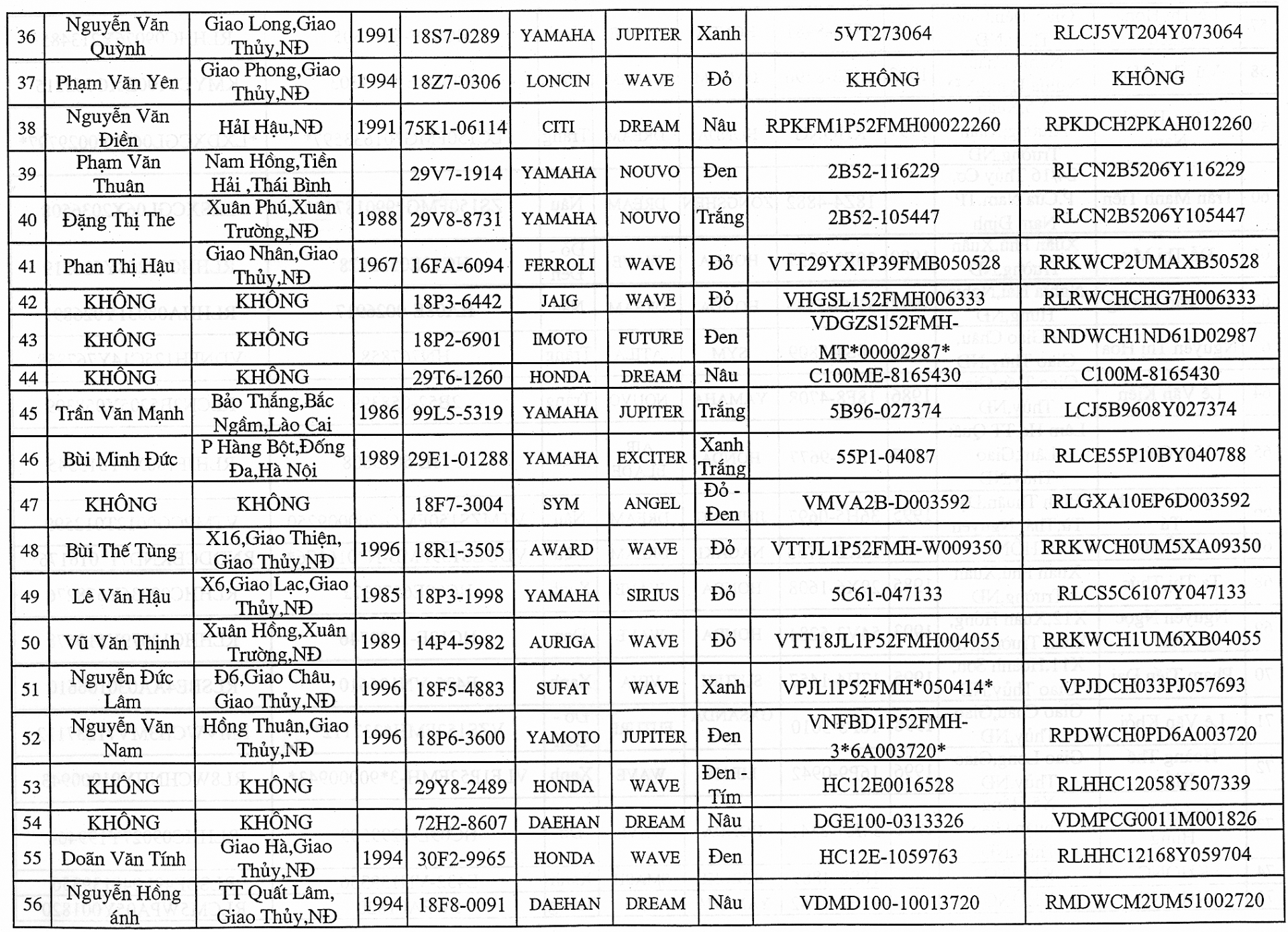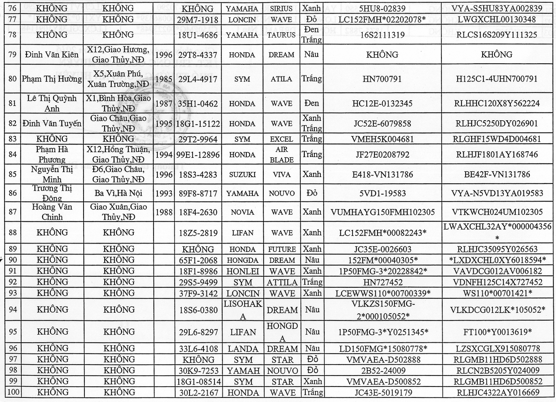 Hiện nay Công an huyện Giao Thuỷ - Nam Định đang tạm giữ 103 xe môtô vi phạm hành chính về trật tự an toàn giao thông đường bộ (có danh sách kèm theo) đã quá thời hạn tạm giữ phương tiện nhưng chưa biết rõ chủ sở hữu, người vi phạm hoặc chủ sở hữu, người vi phạm không đến liên hệ giải quyết để nhận lại phương tiện.