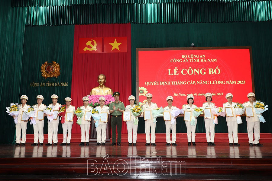 Năm 2023, Công an Hà Nam vinh dự có 792 đồng chí được thăng cấp bậc hàm và nâng bậc lương. Trong đó, 17 đồng chí được Bộ trưởng Bộ Công an ký các Quyết định thăng cấp bậc hàm và nâng bậc lương; 775 đồng chí được Giám đốc Công an tỉnh ký Quyết định thăng cấp bậc hàm, nâng bậc lương.