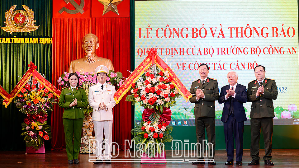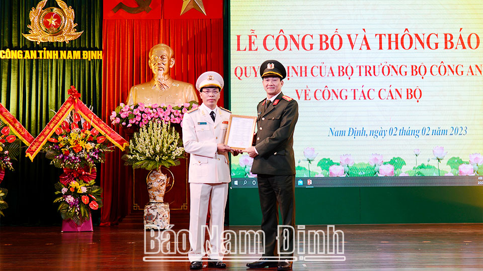 Tại hội nghị, Công an tỉnh đã thông báo Quyết định số 589/QĐ-BCA của Bộ trưởng Bộ Công an về việc điều động Đại tá Nguyễn Văn Trầm, Phó Giám đốc Công an tỉnh Nam Định đến nhận nhiệm vụ Phó Tư lệnh Bộ Tư lệnh Cảnh sát cơ động (Bộ Công an) từ ngày 1-2-2023; công bố Quyết định số 438/QĐ-BCA của Bộ trưởng Bộ Công an về việc điều động Đại tá Chu Văn Phú, Phó Cục trưởng Cục Cảnh sát điều tra tội phạm về ma túy (Bộ Công an) đến nhận công tác, giữ chức vụ Phó Giám đốc Công an tỉnh Nam Định từ ngày 1-2-2023.