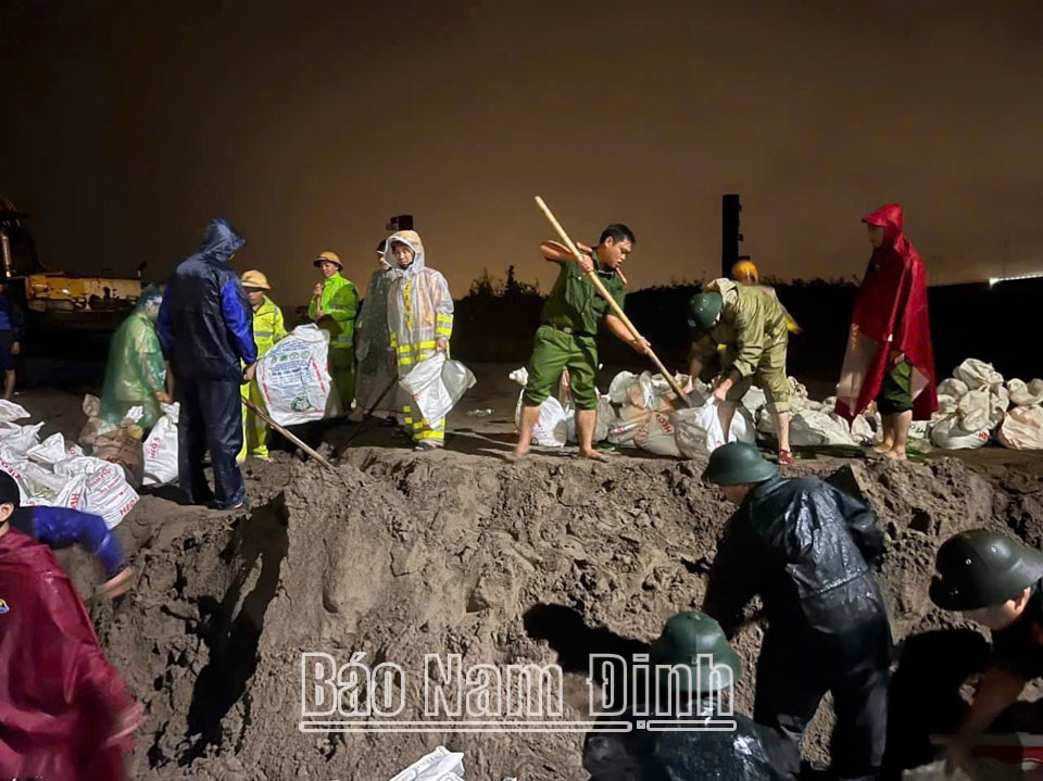 | Cán bộ, chiến sĩ Công an Thành phố Nam Định tham gia gia cố các vị trí đê xung yếu ở xã Mỹ Tân (thành phố Nam Định). Ảnh: Công an tỉnh. |