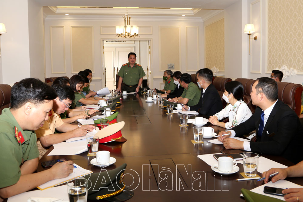 Đại tá Nguyễn Quốc Hùng, Ủy viên BTV Tỉnh ủy, Giám đốc Công an tỉnh phát biểu tại buổi làm việc với lãnh đạo Khách sạn Vinpearl (TP. Phủ Lý)