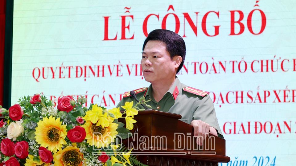 Phát biểu chỉ đạo tại buổi lễ, đồng chí Đại tá Nguyễn Hữu Mạnh, Giám đốc Công an tỉnh đề nghị cấp ủy, lãnh đạo Công an các huyện, thành phố khẩn trương chỉ đạo ổn định tổ chức bộ máy, ban hành quyết định bố trí công tác đối với cán bộ, chiến sĩ theo thẩm quyền; phân công nhiệm vụ cụ thể cho từng đồng chí lãnh đạo, chỉ huy; hoàn thiện việc bàn giao tài liệu, trang bị, phương tiện, cơ sở vật chất... phục vụ yêu cầu công tác, chiến đấu. Kết hợp với việc kiện toàn tổ chức bộ máy, bố trí sắp xếp cán bộ, yêu cầu Công an các huyện, thành phố tập trung chỉ đạo, sớm hoàn thiện, kiện toàn các tổ chức đảng, cấp ủy; chuyển sinh hoạt đảng, quản lý hồ sơ đảng viên theo đúng quy định. Cấp ủy, lãnh đạo Công an các đơn vị, địa phương phát huy vai trò, lựa chọn cán bộ có phẩm chất, đạo đức, năng lực, đáp ứng yêu cầu, nhiệm vụ công tác của từng đơn vị, đảm bảo tinh, gọn, mạnh. Các đơn vị nghiệp vụ, Công an các huyện, thành phố tập trung xây dựng và triển khai các phương án tăng cường bảo đảm an ninh trật tự trước, trong và sau thời điểm sắp xếp đơn vị hành chính cấp huyện, cấp xã.