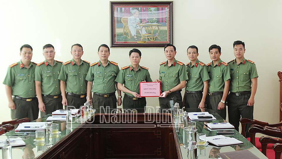 | Đại tá Nguyễn Hữu Mạnh, Ủy viên Ban TVTU, Giám đốc Công an tỉnh trao thưởng cho tổ công tác Công an tỉnh thực hiện kế hoạch bắt giữ đối tượng. |