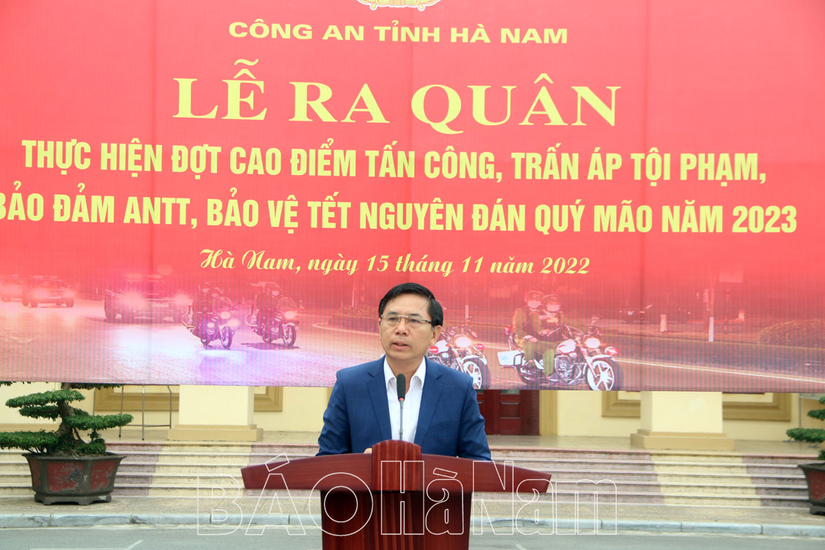 Phát biểu tại buổi lễ, đồng chí Trần Xuân Dưỡng, Tỉnh ủy viên, Phó Chủ tịch UBND tỉnh, Trưởng BCĐ phòng chống tội phạm, TNXH và phong trào Toàn dân bảo vệ ANTQ tỉnh ghi nhận, đánh giá cao kế hoạch đợt cao điểm tấn công trấn áp tội phạm Công an tỉnh đã xây dựng. Đồng chí Phó Chủ tịch UBND tỉnh yêu cầu: các địa phương, lãnh đạo các sở, ban, ngành, đoàn thể các cấp tích cực hưởng ứng, phối hợp chặt chẽ với lực lượng Công an trong công tác bảo đảm ANTT, phát động mạnh mẽ phong trào toàn dân bảo vệ ANTQ. Cùng với đó, toàn lực lượng Công an triển khai các phương án, kế hoạch công tác đảm bảo ANTT, quyết tâm cao để đạt chỉ tiêu đặt ra, thực hiện quyết liệt, có hiệu quả đợt cao điểm tấn công trấn áp tội phạm, không để bị động, đột xuất, bất ngờ.