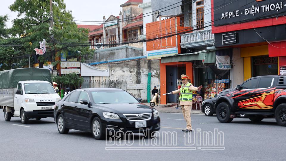 | Lực lượng Cảnh sát giao thông hướng dẫn phương tiện di chuyển trên Quốc lộ 10, huyện Vụ Bản. |