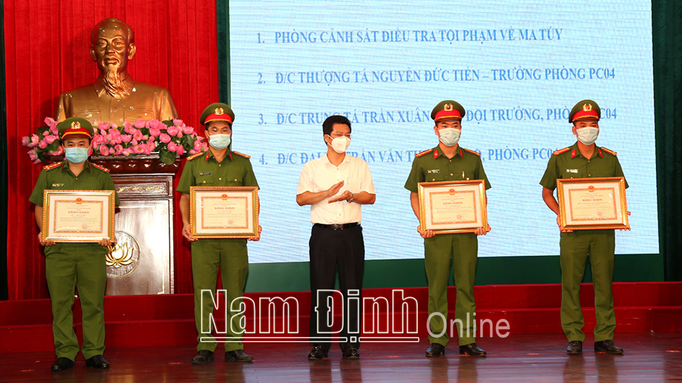 Tại hội nghị, đồng chí Giám đốc Công an tỉnh đã thông báo những kết quả nổi bật trong công tác phòng, chống tội phạm những tháng đầu năm. Trong đó Công an tỉnh đã phát động huy động lực lượng, triển khai đồng bộ các biện pháp công tác trong phòng ngừa, đấu tranh với các loại tội phạm và đã lập nhiều thành tích xuất sắc, tiêu biểu như: Bảo vệ tuyệt đối an toàn cuộc bầu cử đại biểu Quốc hội khóa XV và đại biểu HĐND các cấp, nhiệm kỳ 2021-2026; hoàn thành đặc biệt xuất sắc chiến dịch thu nhận hồ sơ cấp căn cước công dân; phát huy vai trò xung kích của lực lượng Công an tham gia tuyến đầu phòng, chống dịch COVID-19; áp dụng đồng bộ các biện pháp nghiệp vụ, xác minh, truy bắt đối tượng truy nã đặc biệt nguy hiểm, chủ mưu cầm đầu trong vụ án giết người, xảy ra tại thị trấn Cổ Lễ (Trực Ninh). Truy bắt đối tượng có lệnh truy nã quốc tế của Interpol về tội “Sản xuất trái phép chất ma túy, chất hướng thần và thuốc độc” liên quan tới đường dây hoạt động mua bán ma túy xuyên quốc gia. Điều tra, bắt giữ đối tượng hoạt động lưu động trộm cắp liên huyện, làm rõ 29 vụ trộm cắp tài sản là các dây trung tính tại các trạm biến áp trên địa bàn tỉnh, đặc biệt là phá chuyên án 521H, triệt xóa đường dây mua bán, tàng trữ, vận chuyển trái phép chất ma túy với số lượng lớn từ Thành phố Hồ Chí Minh về Nam Định tiêu thụ, thu giữ 12 bánh heroin, 60 triệu đồng, 1 xe máy, 6 điện thoại di động và nhiều vật chứng khác có liên quan. Tại hội nghị, đồng chí Phó Chủ tịch Thường trực UBND tỉnh Trần Anh Dũng đã trao tặng Bằng khen của UBND tỉnh cho Đại tá Phạm Văn Long, Ủy viên Ban TVTU, Giám đốc Công an tỉnh và 1 tập thể, 3 cá nhân. Giám đốc Công an tỉnh đã trao tặng Giấy khen cho 1 tập thể và 25 cá nhân có thành tích xuất sắc trong công tác phòng, chống tội phạm…
