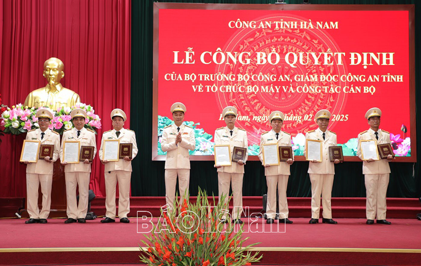 Chiều 27/2, Công an tỉnh Hà Nam tổ chức Lễ công bố các quyết định của Bộ trưởng Bộ Công an, Giám đốc Công an tỉnh về tổ chức bộ máy và công tác cán bộ. Dự, chỉ đạo có đồng chí Trương Quốc Huy, Phó Bí thư Tỉnh ủy, Chủ tịch UBND tỉnh, Trưởng Đoàn đại biểu Quốc hội tỉnh; Thiếu tướng Phạm Công Nguyên, Cục trưởng Cục Pháp chế và cải cách hành chính, tư pháp, Bộ Công an; lãnh đạo các sở, ban, ngành, địa phương. Đại tá Tô Anh Dũng, Ủy viên BTV Tỉnh uỷ, Bí thư Đảng uỷ, Giám đốc Công an tỉnh chủ trì buổi lễ. Cùng dự có các đồng chí lãnh đạo Công an tỉnh; nguyên lãnh đạo Công an tỉnh; lãnh đạo, chỉ huy công an các đơn vị, địa phương trên địa bàn tỉnh.