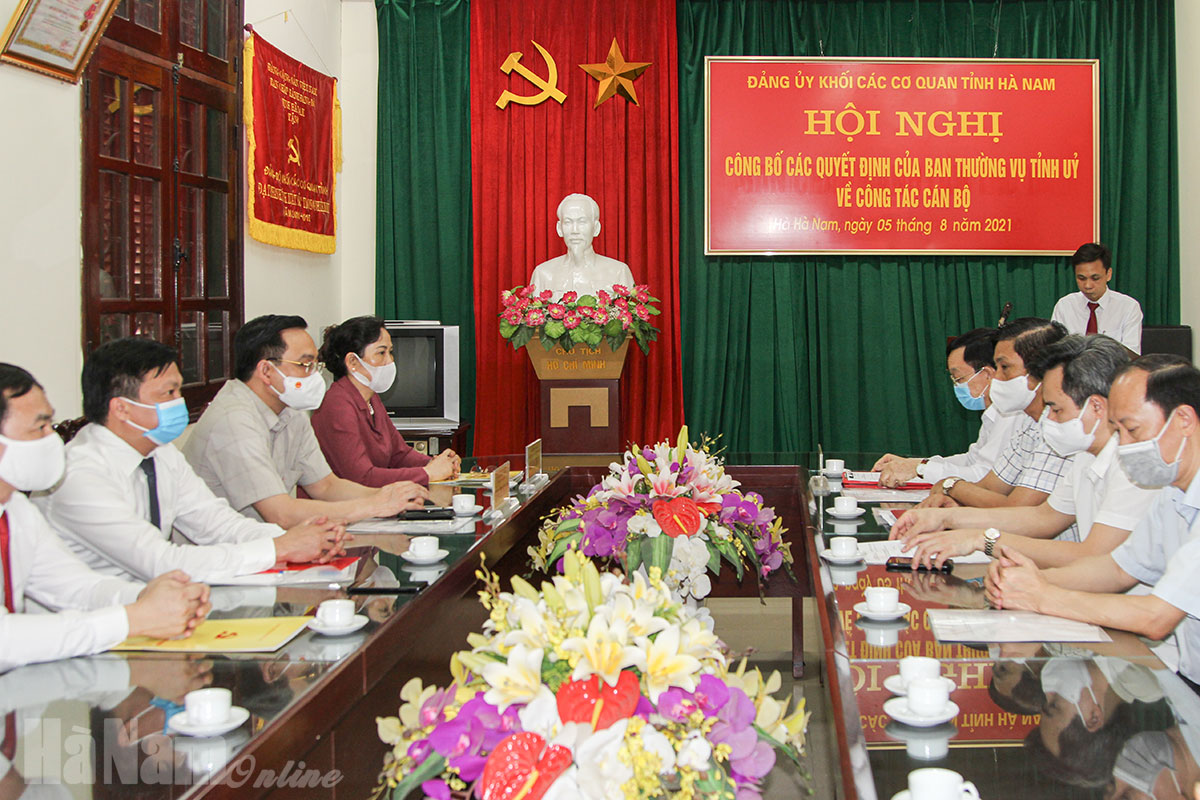 Tại hội nghị, đồng chí Đặng Đình Thoảng, Ủy viên BTV Tỉnh ủy, Trưởng Ban Tổ chức Tỉnh ủy đã công bố các quyết định của BTV Tỉnh ủy về việc: điều động, phân công đồng chí Phạm Hùng Thắng, Ủy viên Ban Chấp hành Đảng bộ tỉnh khóa XX, Bí thư Đảng ủy khối các cơ quan tỉnh thôi tham gia BCH Đảng bộ, BTV Đảng ủy và thôi giữ chức Bí thư Đảng ủy Khối các cơ quan tỉnh để giữ chức Phó trưởng Đoàn Đại biểu Quốc hội chuyên trách khóa XV tỉnh Hà Nam; điều động, phân công đồng chí Đặng Anh Tuấn, Ủy viên Ban Chấp hành Đảng bộ tỉnh khóa XX, Phó Giám đốc Sở Công thương thôi giữ chức Phó Giám đốc Sở Công thương đến nhận công tác tại cơ quan Đảng ủy Khối các cơ quan tỉnh; tham gia Ban chấp hành (BCH), BTV Đảng ủy và giữ chức Bí thư Đảng ủy Khối các cơ quan tỉnh nhiệm kỳ 2020-2025; .