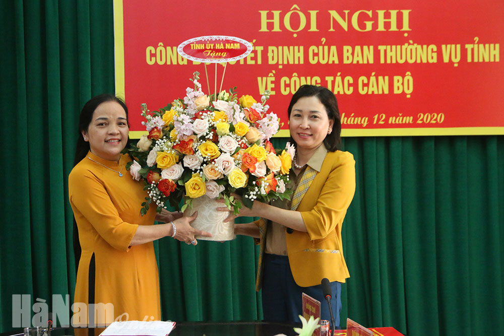 Đồng chí Đinh Thị Lụa, Phó Bí thư Thường trực Tỉnh ủy tặng hoa chúc mừng đồng chí Hà Thị Minh Tâm, nguyên Ủy viên Ban Thường vụ Tỉnh ủy, nguyên Chủ tịch Ủy ban MTTQ tỉnh, nguyên Trưởng đoàn đại biểu Quốc hội tỉnh.Đồng chí Đinh Thị Lụa, Phó Bí thư Thường trực Tỉnh ủy tặng hoa chúc mừng đồng chí Trần Thị Ngân, Ủy viên Ban Thường vụ Tỉnh ủy, Chủ tịch Ủy ban MTTQ tỉnh nhiệm kỳ 2019 - 2024