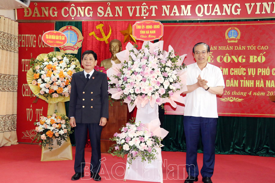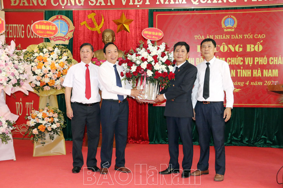 Sáng 26/4, tại Tòa án Nhân dân tỉnh Hà Nam, Tòa án Nhân dân tối cao đã tổ chức Lễ công bố và trao quyết định bổ nhiệm chức vụ Phó Chánh án Tòa án Nhân dân tỉnh Hà Nam.