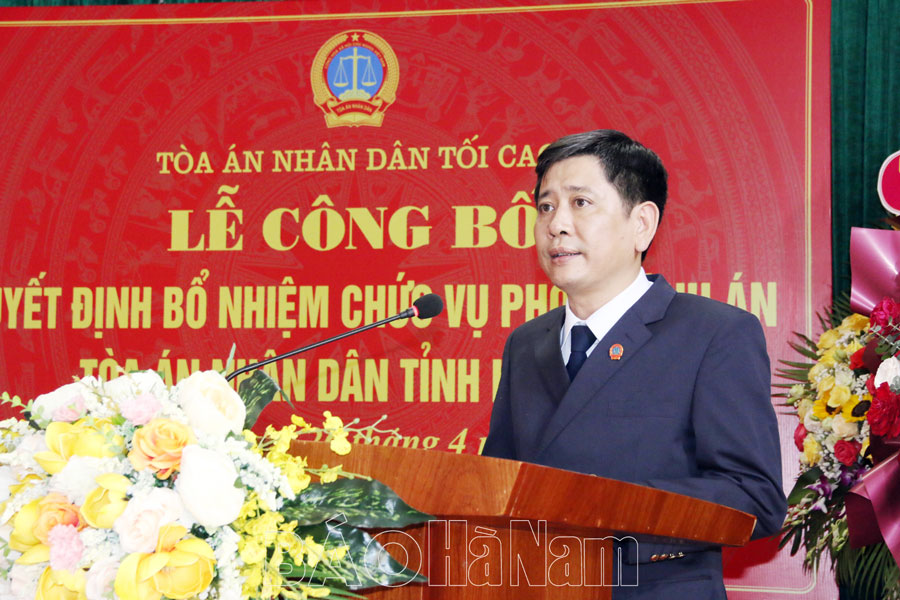 Tại buổi lễ, đại diện Vụ Tổ chức cán bộ, Tòa án Nhân dân tối cao đã công bố Quyết định số 655, ngày 16/4/2024 của Chánh án Tòa án Nhân dân tối cao về việc bổ nhiệm ông Nguyễn Thanh Hải, sinh năm 1975, Thẩm phán trung cấp, Chánh tòa Hình sự Tòa án Nhân dân tỉnh Hà Nam giữ chức vụ Phó Chánh án Tòa án Nhân dân tỉnh Hà Nam. Thời gian bổ nhiệm là 5 năm, kể từ ngày 1/5/2024.