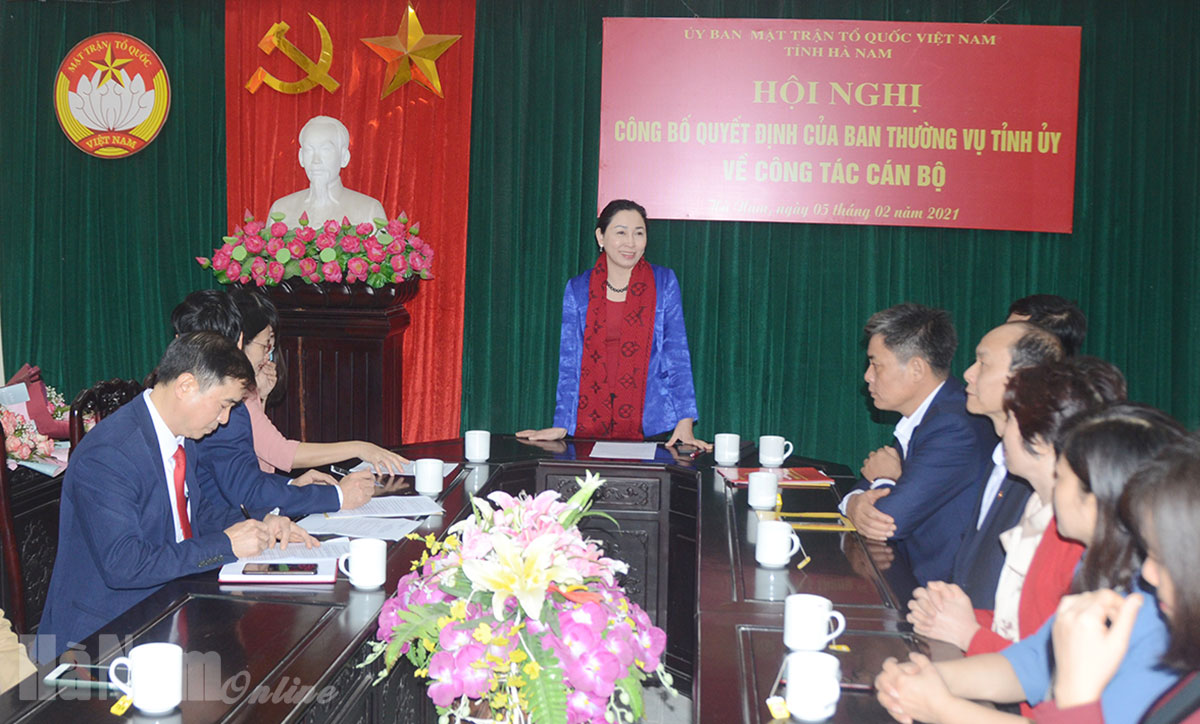 Sáng 5/2, Ủy ban Mặt trận Tổ quốc (MTTQ) tỉnh tổ chức hội nghị công bố Quyết định của Ban Thường vụ (BTV) Tỉnh ủy về công tác cán bộ. Dự hội nghị có các đồng chí: Đinh Thị Lụa, Phó Bí thư Thường trực Tỉnh ủy; Trần Thị Ngân, Ủy viên BTV Tỉnh ủy, Chủ tịch Ủy ban MTTQ tỉnh; lãnh đạo Ban Tổ chức Tỉnh ủy, Ban Dân vận Tỉnh ủy, Văn phòng Tỉnh ủy, Đảng ủy Khối Doanh nghiệp tỉnh, …
