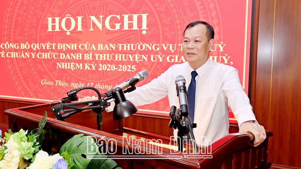 Tại hội nghị, đồng chí Trưởng Ban Tổ chức Tỉnh ủy Nguyễn Văn Va công bố Quyết định số 1245-QĐ/TU, ngày 16/10/2024 của Ban TVTU về chuẩn y đồng chí Doãn Quang Hùng, Phó Bí thư Huyện ủy, Chủ tịch UBND huyện Giao Thủy giữ chức Bí thư Huyện ủy Giao Thủy nhiệm kỳ 2020-2025.