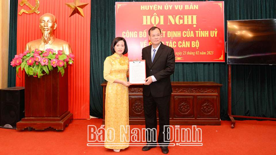 Tại hội nghị, lãnh đạo Ban Tổ chức Tỉnh ủy đã thông báo Quyết định của Ban TVTU về việc điều động đồng chí Đỗ Xuân Tú, Phó Bí thư Thường trực Huyện ủy Vụ Bản nhiệm kỳ 2020-2025, thôi giữ các chức vụ tại Huyện ủy Vụ Bản để điều động, bổ nhiệm giữ chức vụ Phó Giám đốc Sở Công Thương; công bố Quyết định số 624-QĐ/TU, ngày 20-2-2023 của Ban TVTU về việc luân chuyển đồng chí Bùi Ánh Nguyệt, Phó Chủ tịch Liên đoàn Lao động tỉnh, thôi tham gia Đảng đoàn, thôi giữ chức vụ Phó Chủ tịch Liên đoàn Lao động tỉnh để chỉ định tham gia BCH Đảng bộ huyện, Ban Thường vụ Huyện ủy và giữ chức vụ Phó Bí thư Huyện ủy Vụ Bản nhiệm kỳ 2020-2025 từ ngày 22-2-2023.