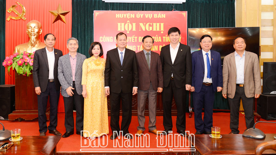 | Các đồng chí lãnh đạo tỉnh và huyện Vụ Bản chụp ảnh lưu niệm. |