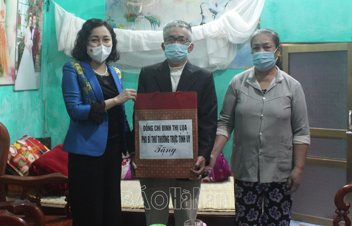 Đồng chí Đinh Thị Lụa, Phó Bí thư Thường trực Tỉnh ủy trao tặng quà gia đình thương binh Nguyễn Quốc Lâm (thị trấn Kiện Khê, Thanh Liêm).