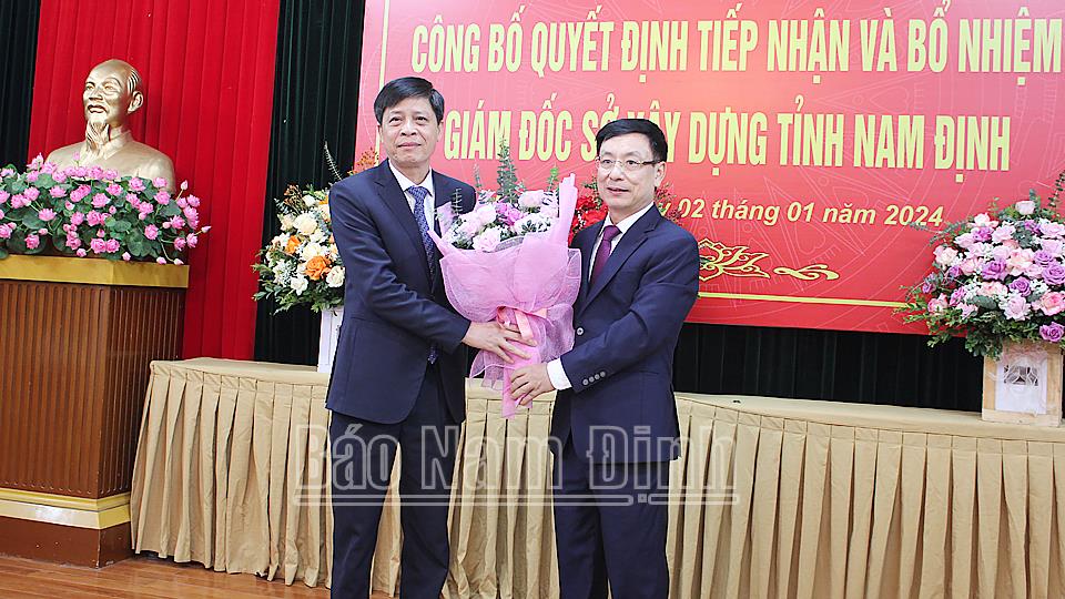 | Đồng chí Chủ tịch UBND tỉnh Phạm Đình Nghị trao Quyết định, tặng hoa chúc mừng đồng chí Trần Văn Hưng, tân Giám đốc Sở Xây dựng. |