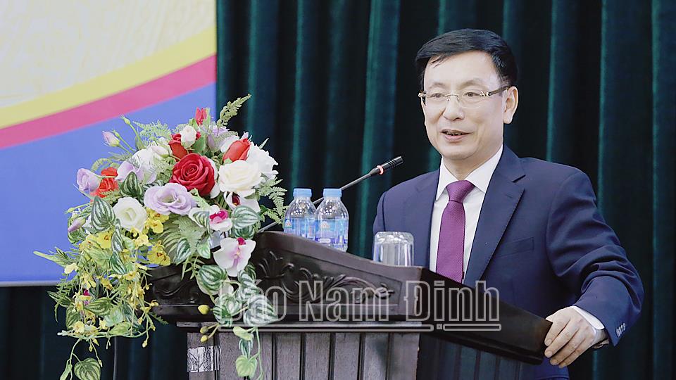 | Đồng chí Chủ tịch UBND tỉnh Phạm Đình Nghị phát biểu chúc mừng và giao nhiệm vụ cho tân Giám đốc Sở Tư pháp Trần Thị Thúy Hiền. |