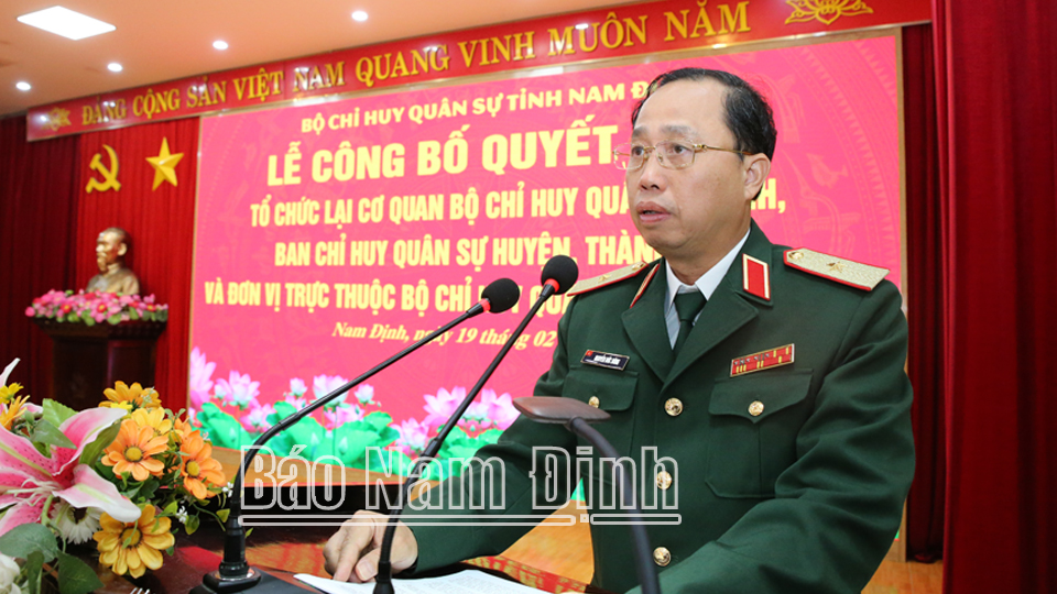 | Đồng chí Đại tá Nguyễn Bá Thịnh, TUV, Chỉ huy trưởng Bộ CHQS tỉnh công bố các Quyết định của Bộ Quốc phòng về tổ chức lại các cơ quan, đơn vị thuộc Bộ CHQS tỉnh Nam Định. |