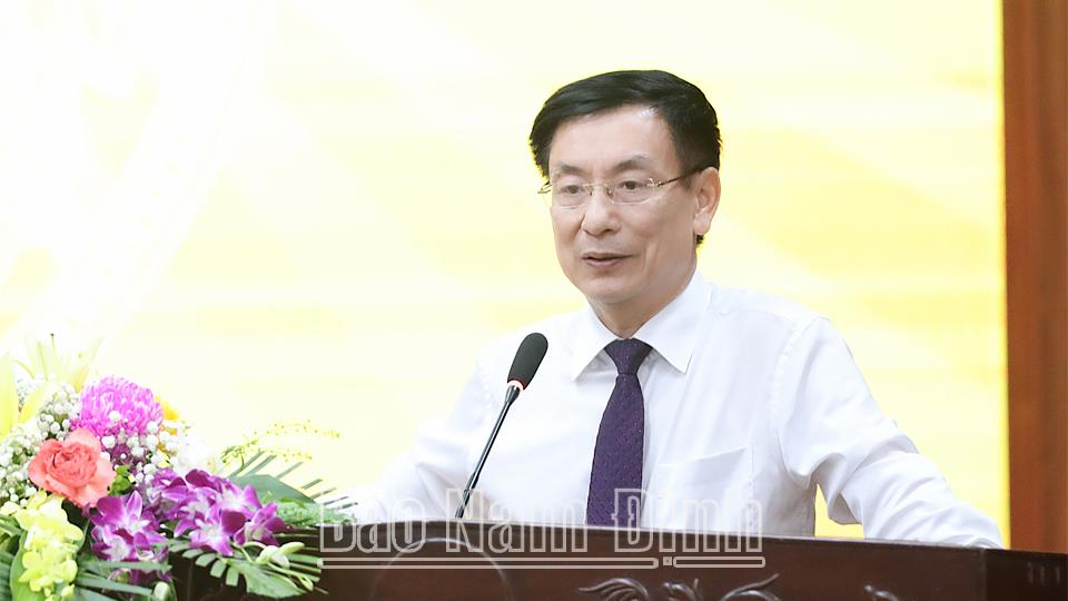 | Đồng chí Chủ tịch UBND tỉnh Phạm Đình Nghị phát biểu giao nhiệm vụ cho đồng chí Nguyễn Xuân Hồng, Giám đốc Sở Giáo dục và Đào tạo. |