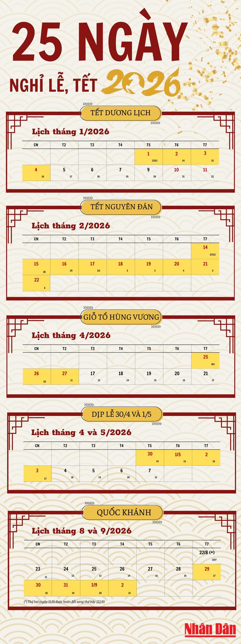 Công chức và người lao động sẽ có 25 ngày nghỉ lễ, Tết trong năm 2026