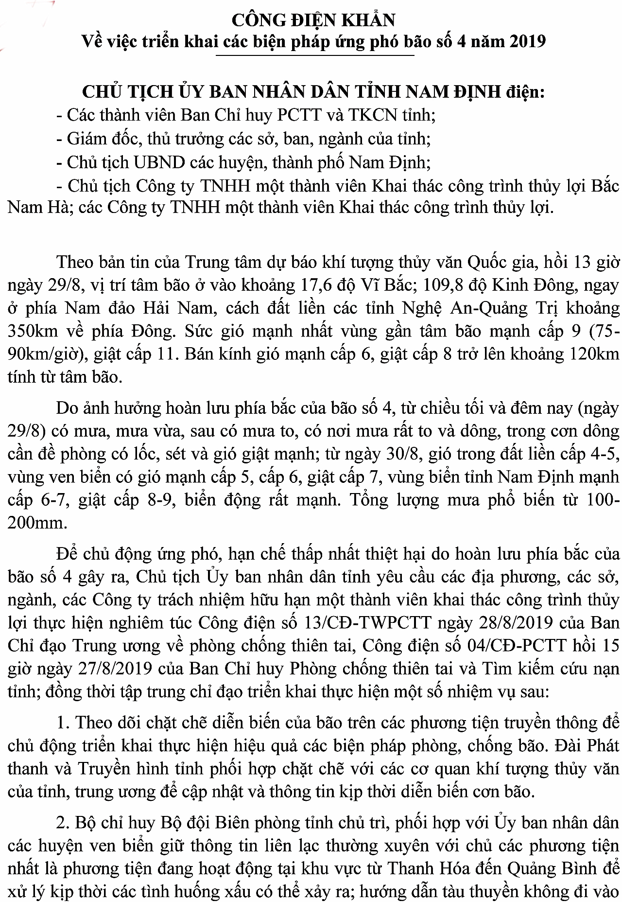 Công điện khẩn của Chủ tịch UBND tỉnh về việc triển khai các biện pháp ứng phó bão số 4 năm 2019