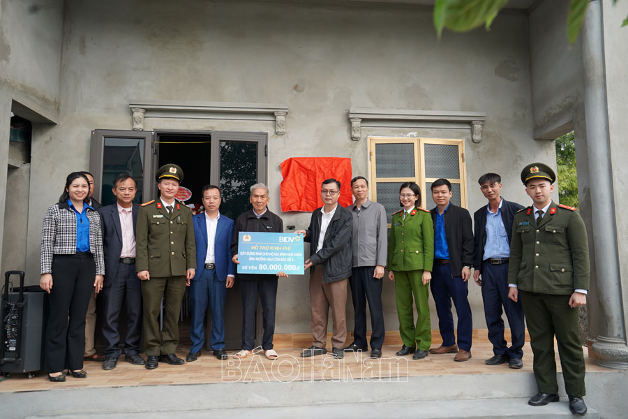 Đại diện Công đoàn BIDV Hà Nam, Công an tỉnh, UBND huyện Thanh Liêm và chính quyền địa phương bàn giao nhà mới cho bà Nguyễn Thị Ân, thôn Bạc, xã Thanh Tân.